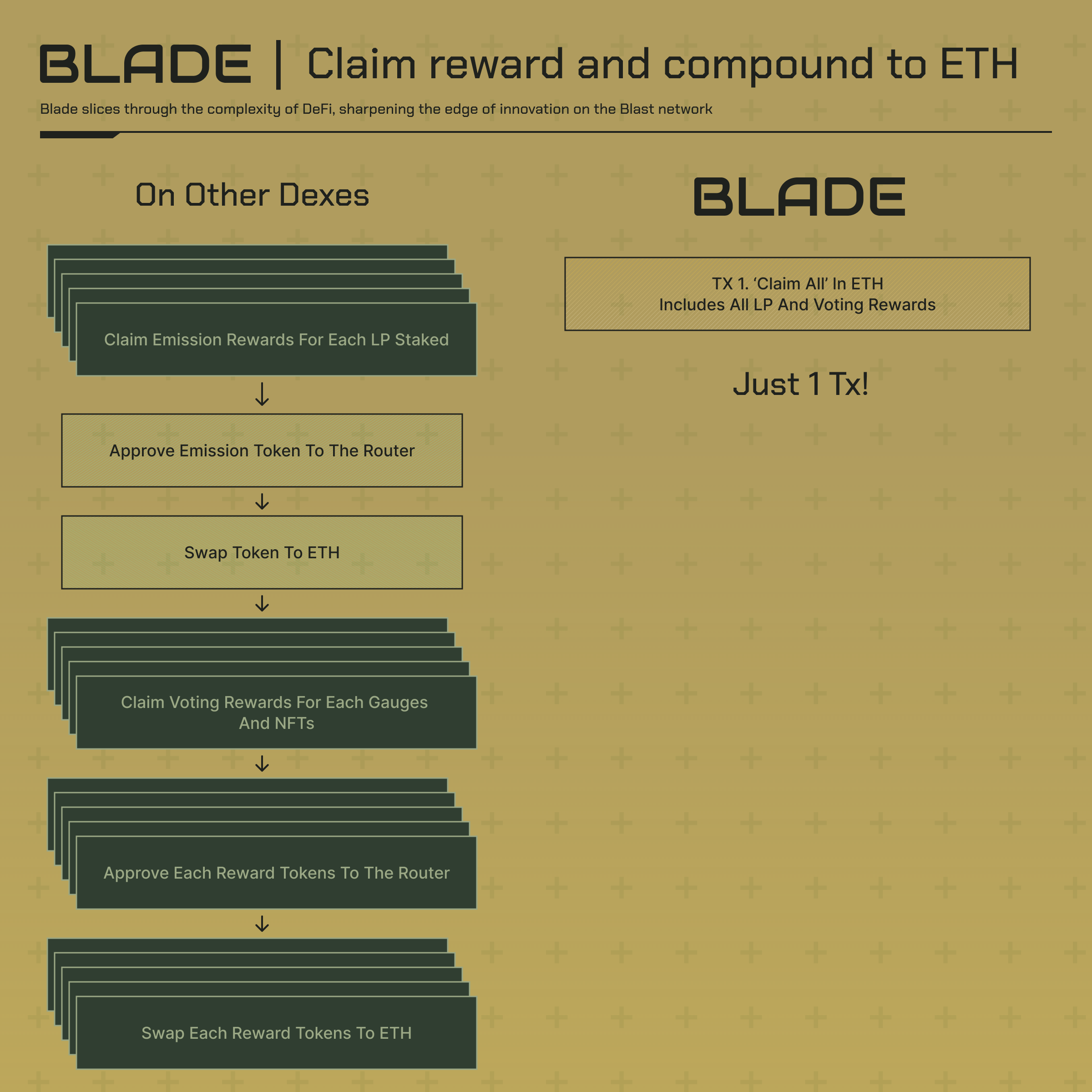 <figure><img src="https://3691657423-files.gitbook.io/~/files/v0/b/gitbook-x-prod.appspot.com/o/spaces%2FzQhrRT6XS36zdLPh1RtR%2Fuploads%2F3m6q2Mhk9PZFTFBOz9XS%2FBlade_Claim.png?alt=media&#x26;token=dcd449db-454d-4395-aaf7-bd2f68642660" alt=""><figcaption><p>Claim rewards and compound to ETH</p></figcaption></figure>