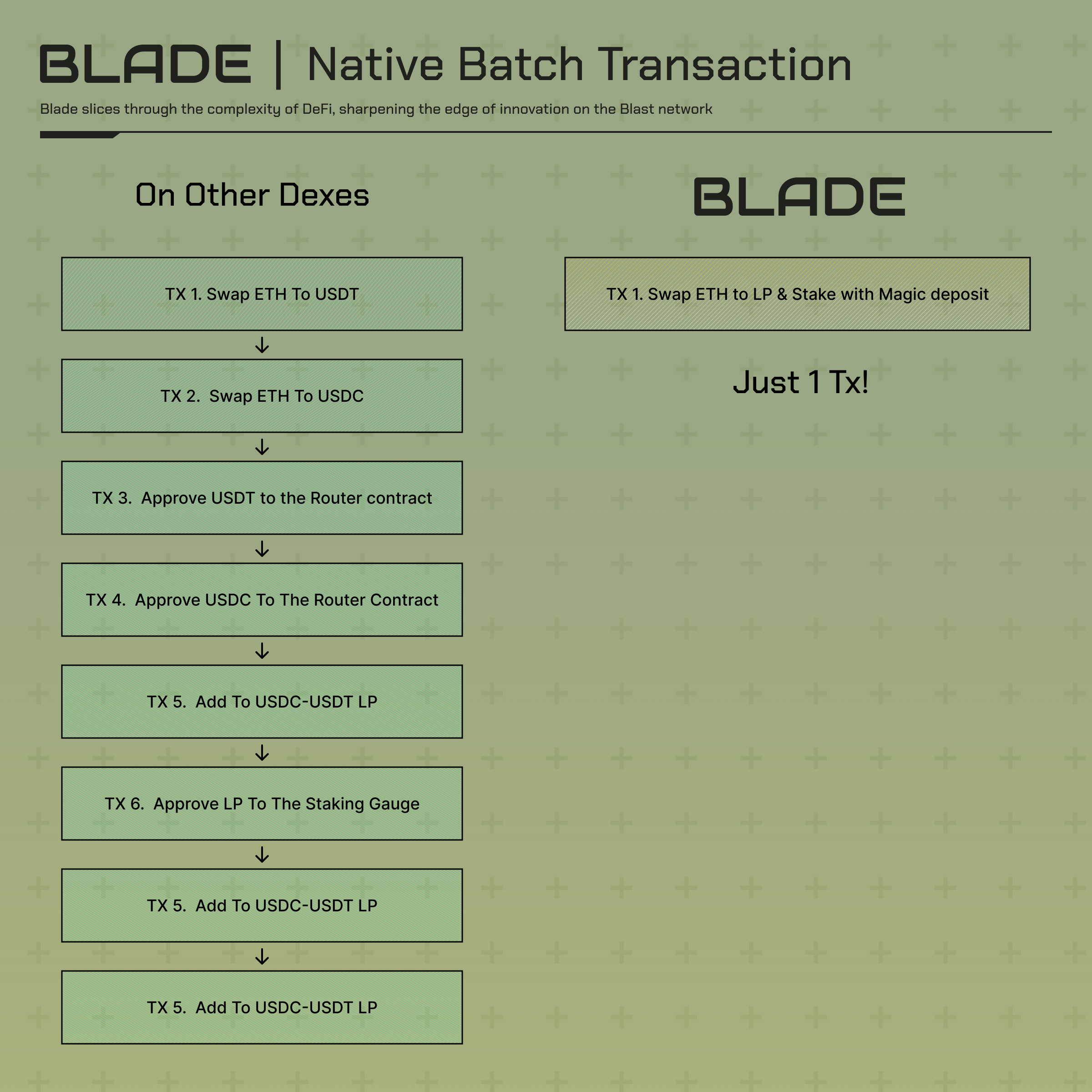 <figure><img src="https://3691657423-files.gitbook.io/~/files/v0/b/gitbook-x-prod.appspot.com/o/spaces%2FzQhrRT6XS36zdLPh1RtR%2Fuploads%2FeZHT4MGKnBQssxXHuBQi%2FBlade_Native%20Batch%20Transaction.png?alt=media&#x26;token=7eca963a-45ea-4a58-9021-7509d216802c" alt=""><figcaption><p>Add &#x26; Stake USDC-USDT LP with your ETH holdings</p></figcaption></figure>
